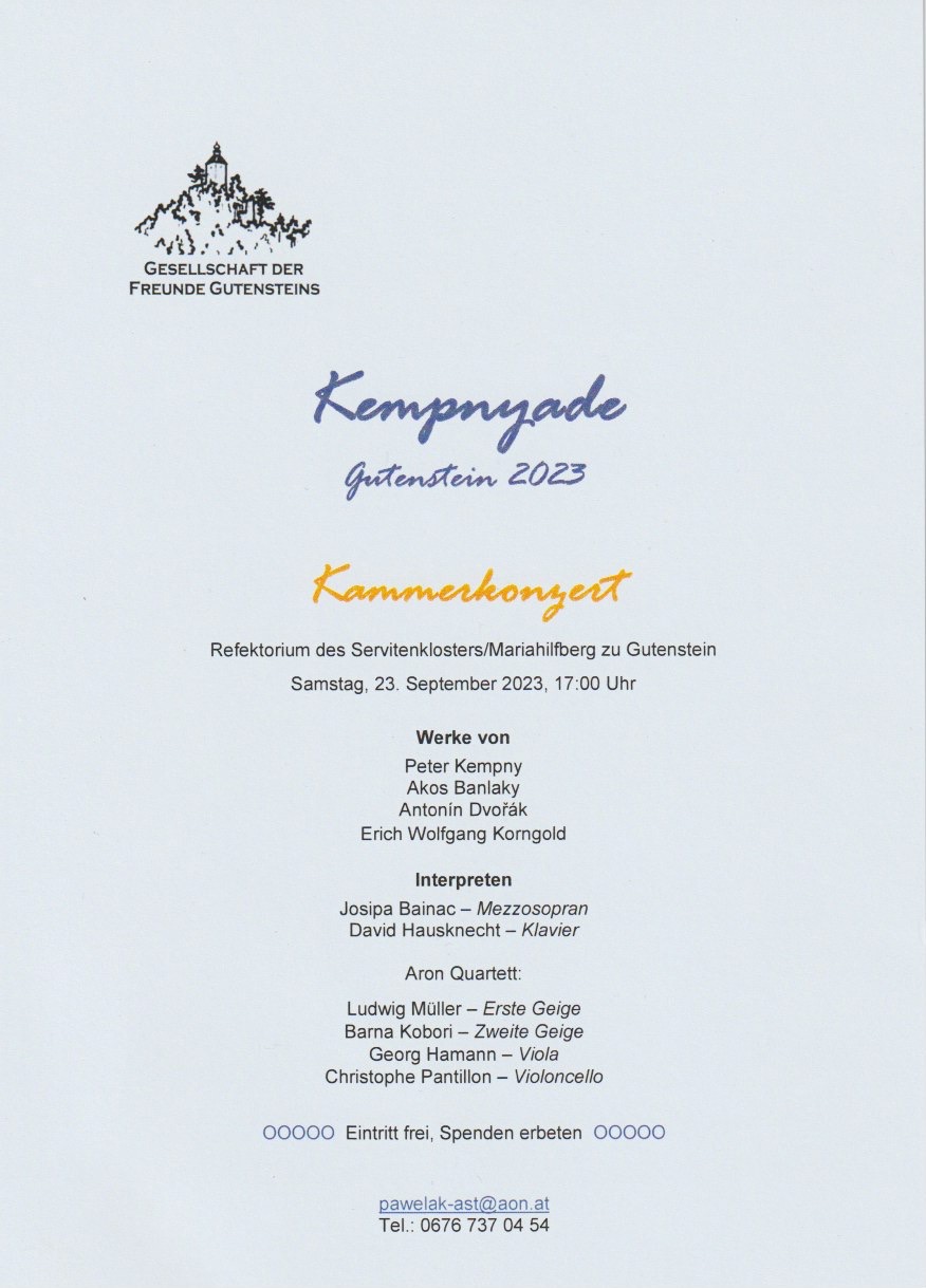 Am 23. September fand im Refektorium auf dem Mariahilfberg wieder ein Kammerkonzert, dargeboten von großartigen Künstlern. Es wurden Werke von Peter Kempny, Akos Banlaky und Antonin Dvorak zur Aufführung gebracht.